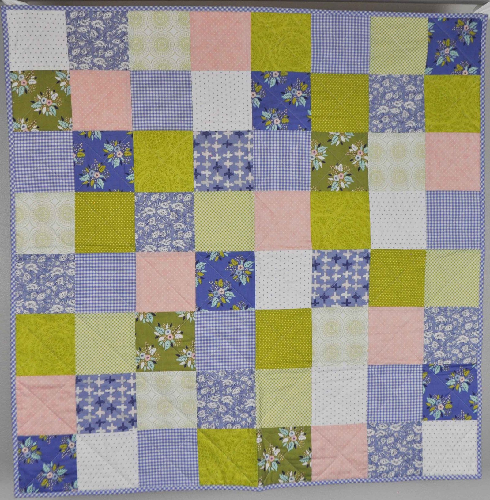 The colors in this quilt blend so beautifully together. There is a slight Bohemian feel and still soft and sweet. There are two versions of this quilt. This one has a pink backing and sewn with X’s in each square. This one is darling.