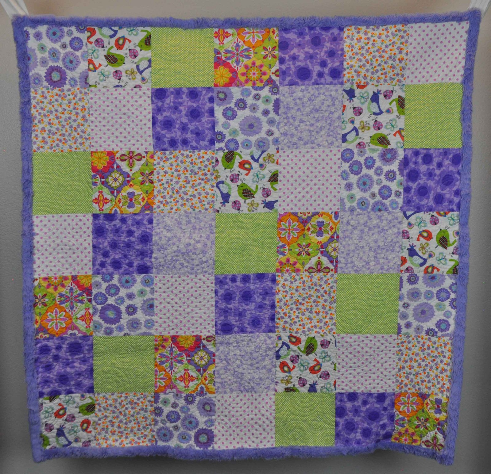 Playful purple, green and orange fabrics sewn patchwork style with thick purple Minky back. There are two versions of this quilt. This one is mostly green and purple.
