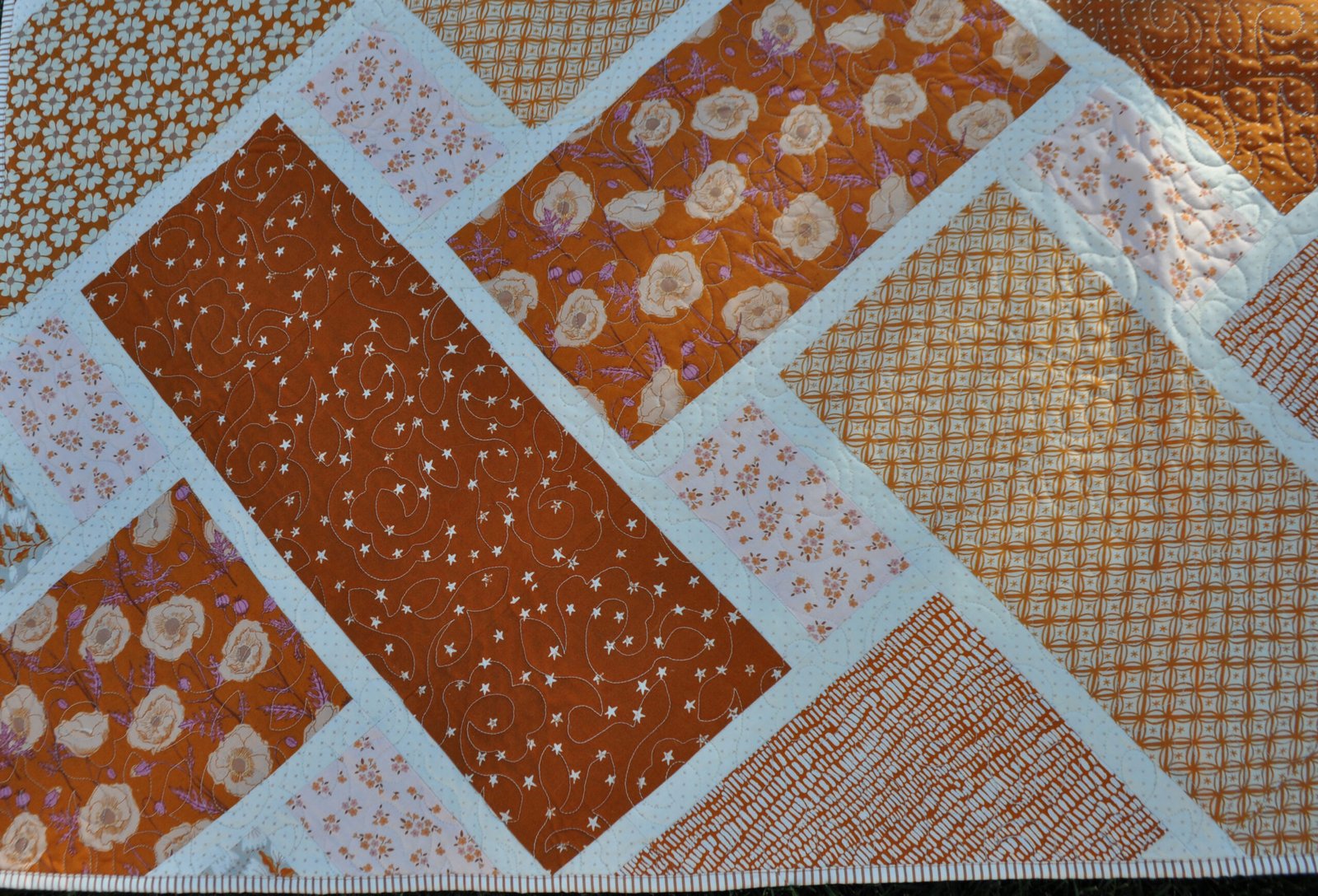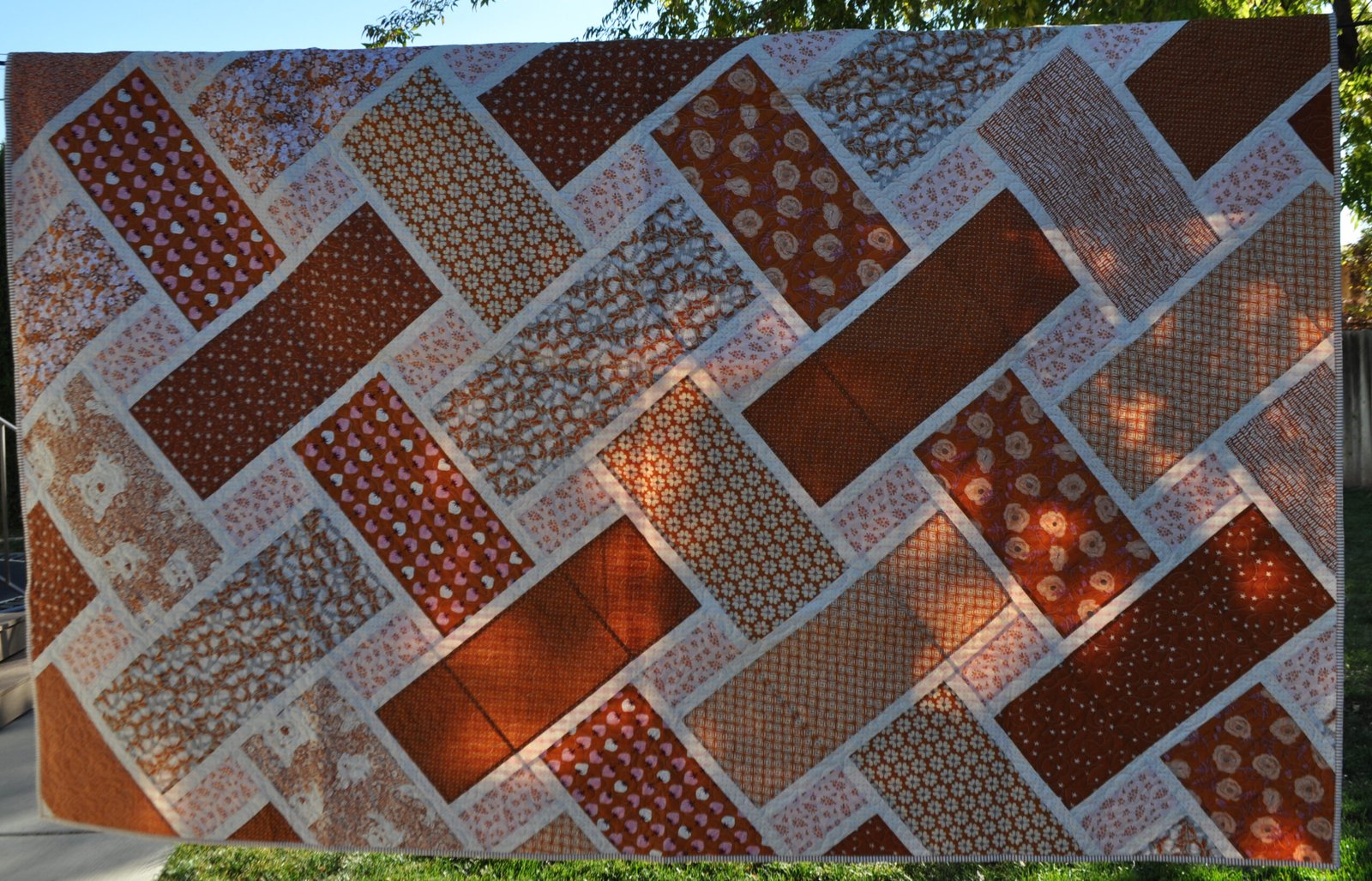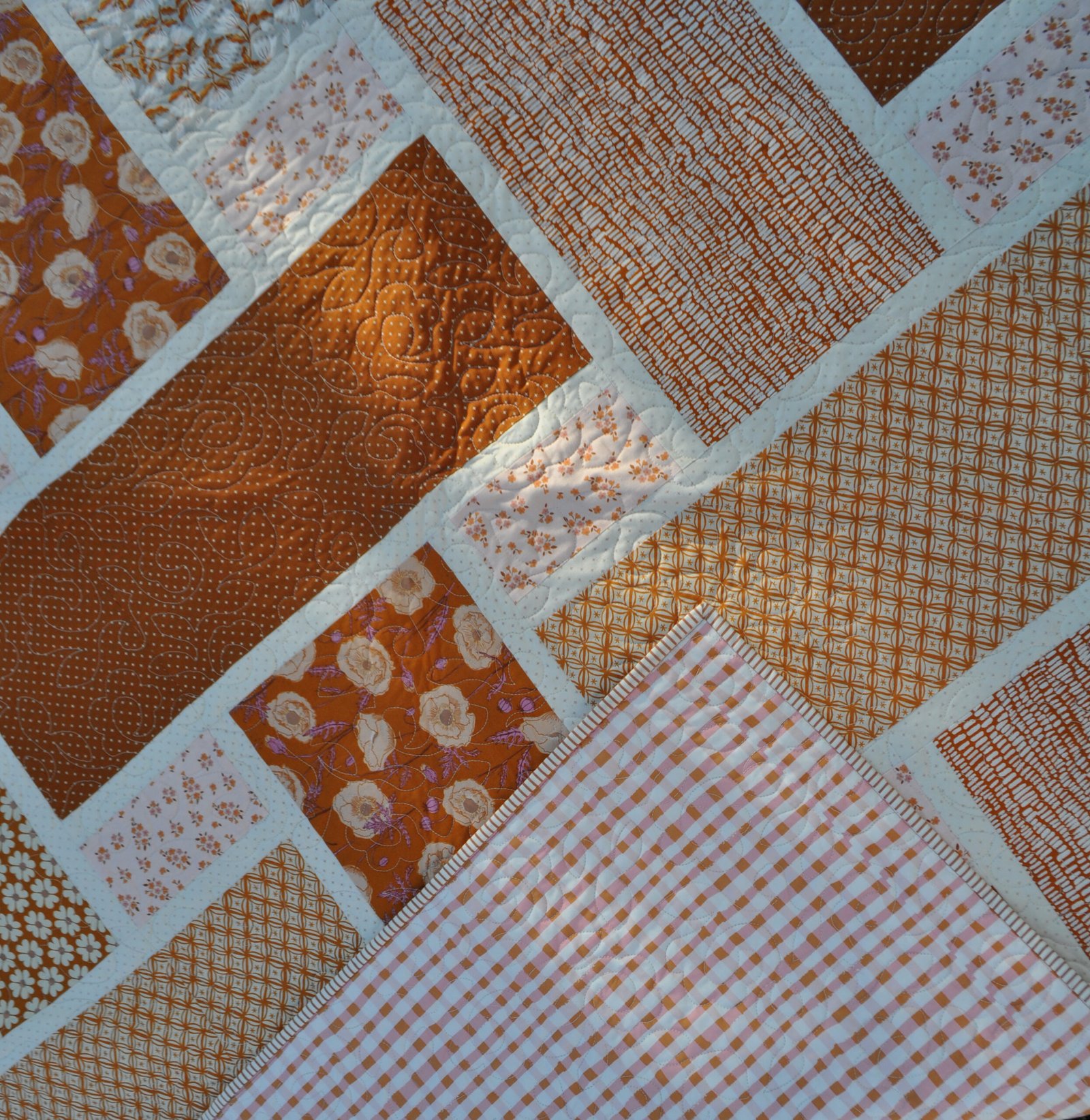 This stunning one-of-a-kind throw quilt showcases a sophisticated lattice design that beautifully highlights hand-selected fabrics in a harmonious palette of warm copper, rust, chocolate brown, and cream tones. Each rectangular block features carefully curated cotton prints, including delicate floral sprays, classic polka dots, geometric patterns, and charming vintage-inspired motifs that create visual interest and texture throughout the piece.